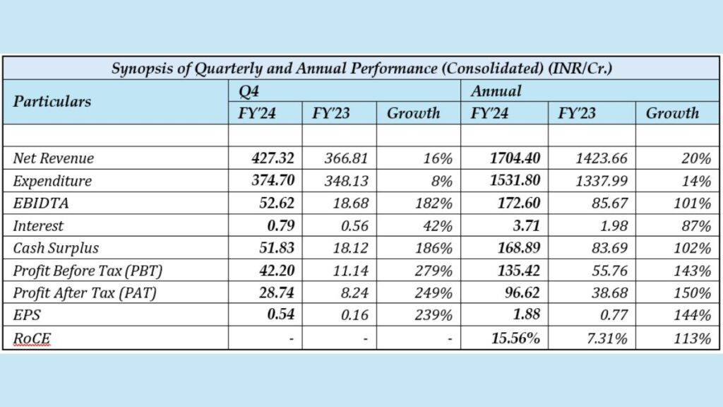 Profit After Tax (PAT): The PAT for Q4’FY24 stood at INR. 28.74 crores, showing a 249% growth compared to INR. 8.24 crores in the same period last year. On an annual basis, PAT increased by 150% to INR. 96.62 crores from INR. 38.68 crores in FY23.